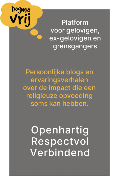 Ben je geraakt door deze gastblog? Wil je reageren? Je kunt je reactie plaatsen onder dit bericht (even omlaag scrollen). LET OP: Opbouwende, verbindende en steunende reacties zijn zeer welkom, kritiek en felle discussies worden niet geplaatst of verwijderd. Gastbloggers op Dogma-vrij wordt op deze manier een beschermde omgeving geboden om hun verhaal te vertellen.